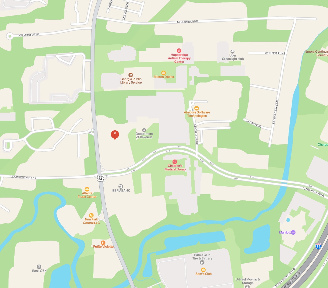 After turning onto Clairmont Rd it is about 1/2 mile to Century Blvd. Take a right on Century Blvd and take your first left turn into Century Lake Office Park. The office is located next to the gazebo by the lake.